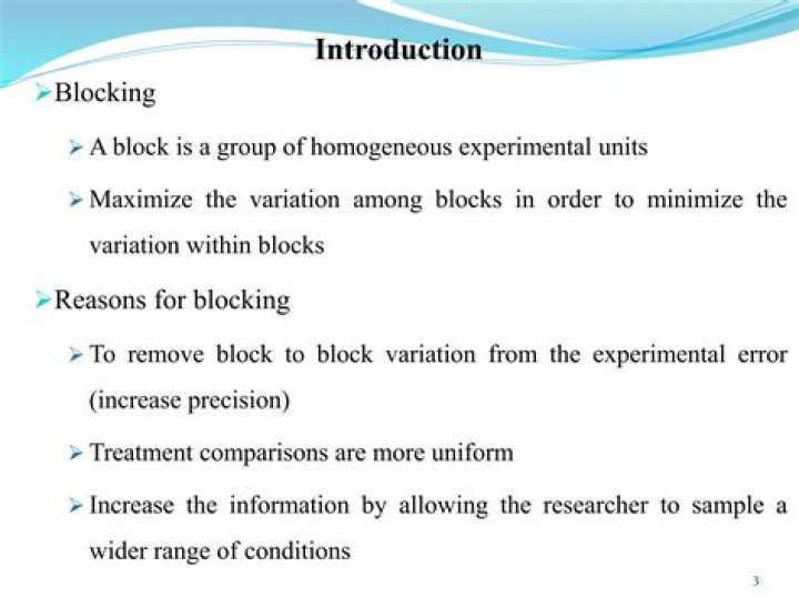*Blocking reduces variation in your results. effects of some outside variables by bringing those variables into the experiment to form the blocks. Separate conclusions can be made from each block, making for more precise conclusions.