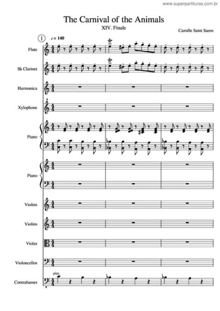 Carnival of the Animals has since become one of Saint-Saëns best known works. It is scored for two pianos, two violins, viola, cello, double bass, flute, piccolo, clarinet (C and B flat), glass harmonica and xylophone.