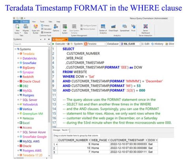 The FORMAT phrase sets the format for a specific TIME or TIMESTAMP column or value….Teradata Database SQL Data Types and Literals.