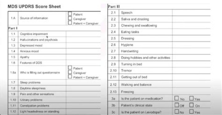 It is estimated that the UPDRS should only take 30 minutes in the clinic, with 10 min for the interview items of Part I, 15 min for the motor assessment of Part III, and 5 min for motor complications of Part IV (Several items in Part I and all of the questions on Part II are filled in by the patient at their leisure).