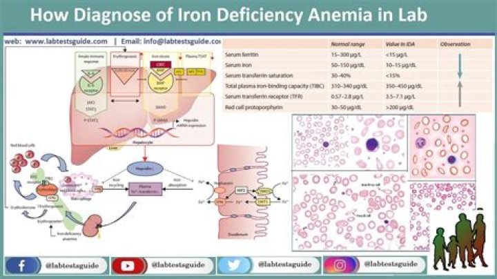 Hemoglobin of less than 13 grams per deciliter (g/dl) for men and less than 12 g/dl for women is diagnostic of anemia. In iron-deficiency anemia, red blood cells will be small in size with an MCV of less than 80 femtoliters (fL).