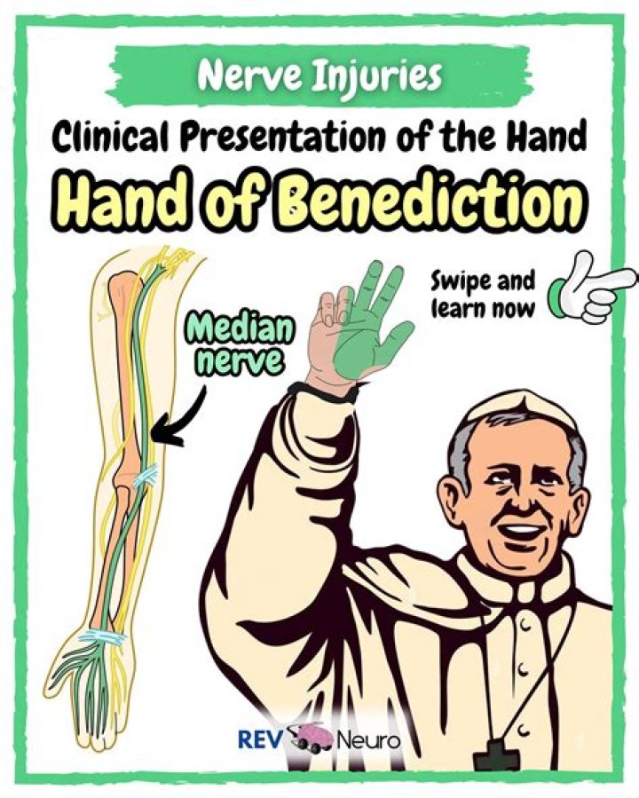 The hand of benediction, also known as benediction sign or preacher’s hand, occurs as a result of prolonged compression or injury of the median nerve at the forearm or elbow.