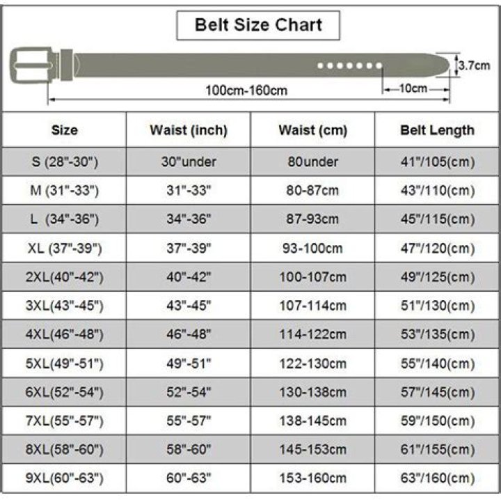 | Belt size (in.) | Belt size (cm) | Waist size (in.) |