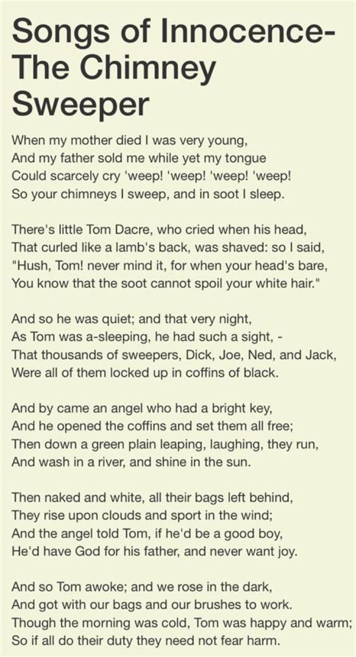 The tone of the poem is one of gentle innocence and trust, which contrasts sharply with its grim subject. The young chimney sweeper’s words show that he and his fellow sweep are in a harsh situation. They are the among most vulnerable in society: young children who are orphaned or unwanted.
