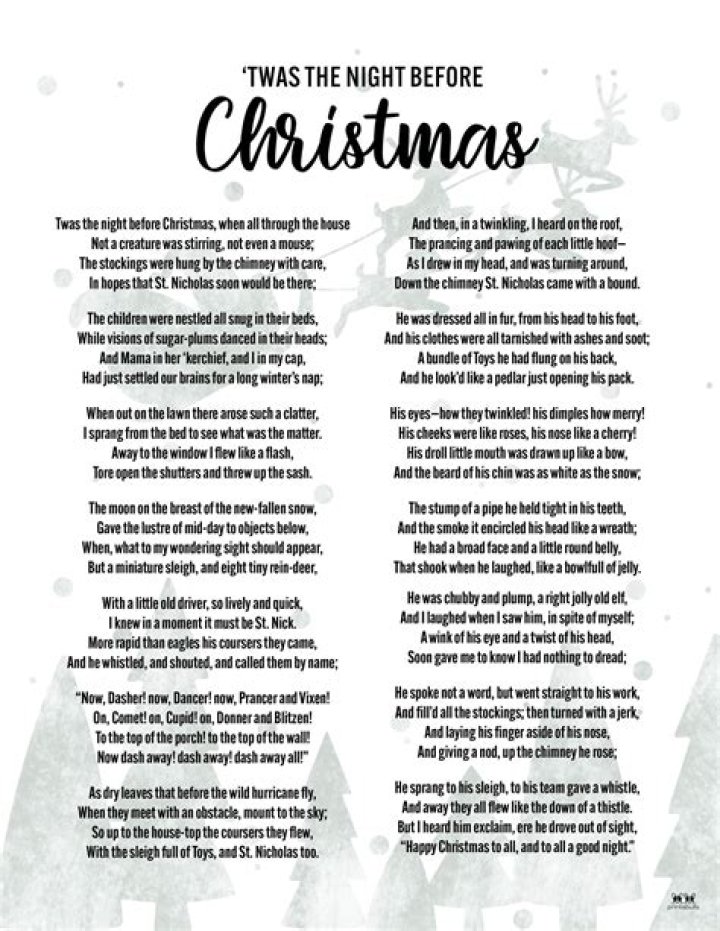 ‘Twas the night before Christmas, when all through the house, not a creature was stirring, not even a mouse. The stockings were hung by the chimney with care, in hopes that Saint Nicholas soon would be there. The children were nestled all snug in their beds, while visions of sugarplums danced in their heads.