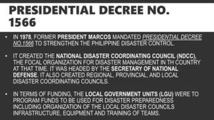 In 1978, former President Marcos mandated Presidential Decree No. 1566 to strengthen Philippine disaster control. It created the National Disaster Coordinating Council, the focal organization for disaster management in the country at that time. It was headed by the Secretary of National Defense.