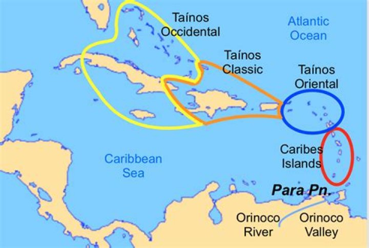 The ancestors of the Taíno entered the Caribbean from South America. At the time of contact, the Taíno were divided into three broad groups, known as the Western Taíno (Jamaica, most of Cuba, and the Bahamas), the Classic Taíno (Hispaniola and Puerto Rico) and the Eastern Taíno (northern Lesser Antilles).