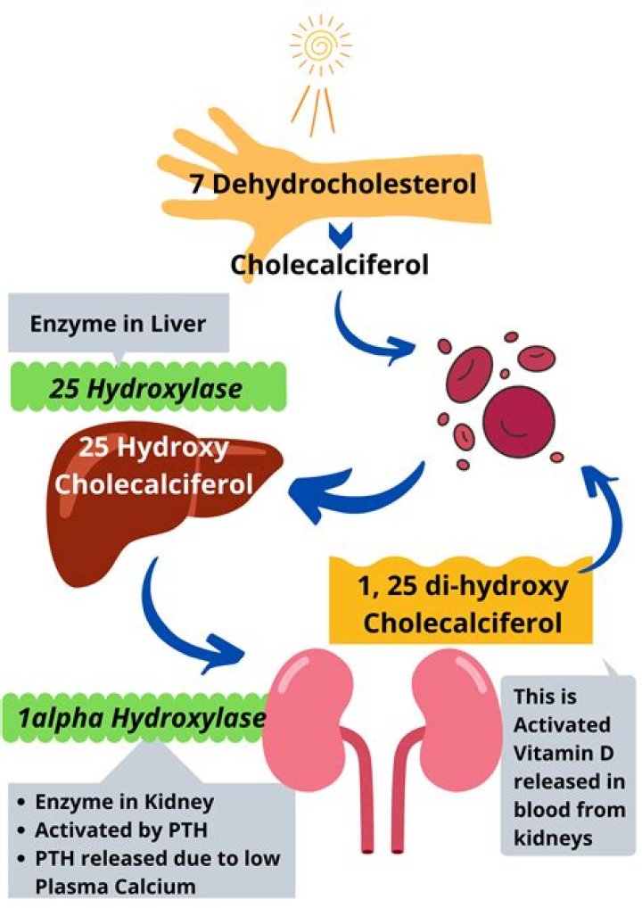 The sources of Vitamin D are dermal exposure to sunlight and dietary ingestion. Vitamin D is first 25-hydroxylated in the liver and then additionally hydroxylated primarily in the kidney at carbon-1 to its active form, 1,25[OH]2D3, by 25-hydroxyvitamin D3-1-α-hydroxylase (CYP27B1, 1α-hydroxylase).