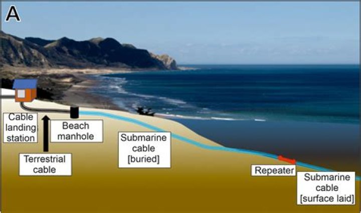 A submarine communications cable is a cable laid on the sea bed between land-based stations to carry telecommunication signals across stretches of ocean and sea. Modern cables use optical fibre technology to carry digital data, which includes telephone, Internet and private data traffic.