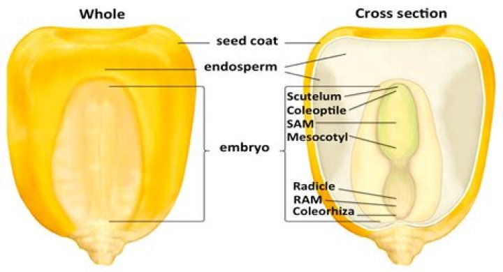 Answer: Monocots, such as corn (right), have one cotyledon, called the scutellum; it channels nutrition to the growing embryo. Both monocot and dicot embryos have a plumule that forms the leaves, a hypocotyl that forms the stem, and a radicle that forms the root.