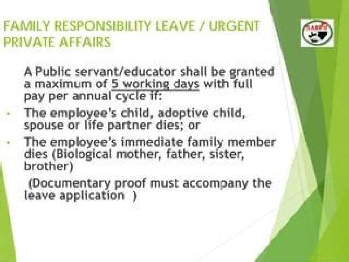 Family responsibility leave is three days paid leave per year, which full-time employees are entitled to over and above annual and sick leave.