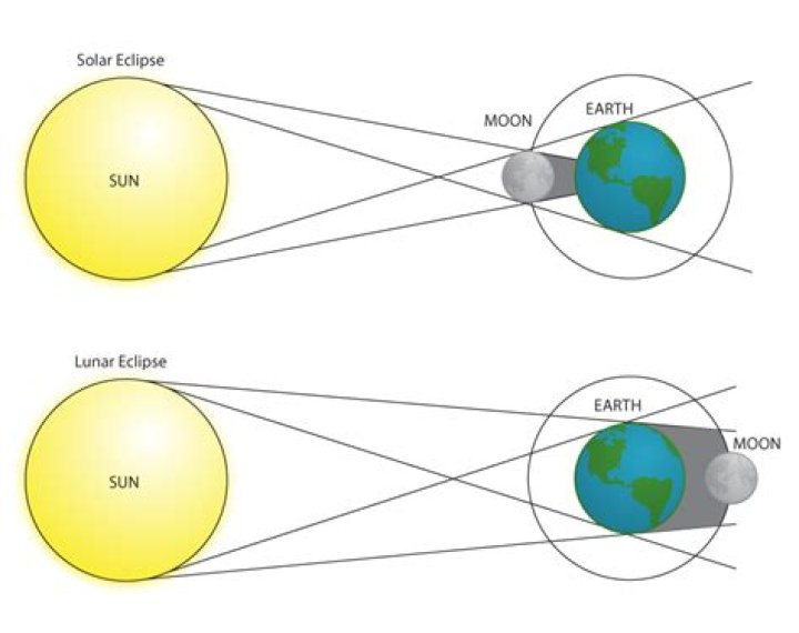 An eclipse happens when one astronomical body blocks light from or to another. In a lunar eclipse, the Moon moves into the shadow of Earth cast by the Sun. In a solar eclipse, the Moon passes between Earth and the Sun and stops some or all of the Sun’s light from reaching Earth.