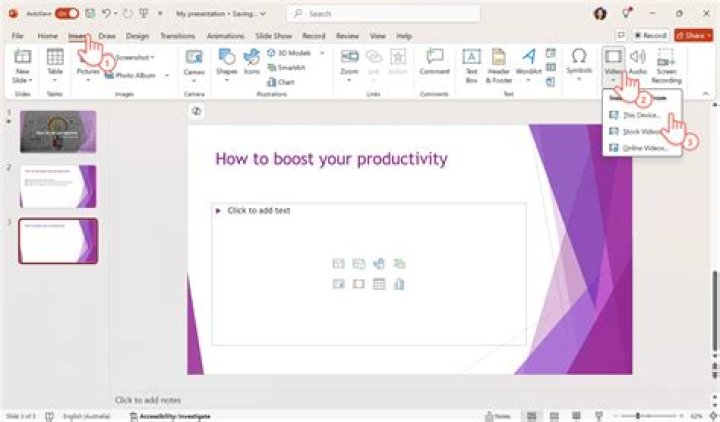 To insert a video from a file on your computer: From the Insert tab, click the Video drop-down arrow and select Video from File. Locate and select the desired video file, then click Insert. The video will be added to the slide.
