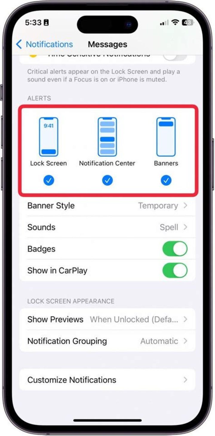 Go to Settings > Notifications, select the app, and make sure that Notifications are turned on. If you have notifications turned on for an app but you’re not receiving alerts, the alert style might be set to None. Go to Settings > Notifications and check that your Alert Style is set to Banners or Alerts.